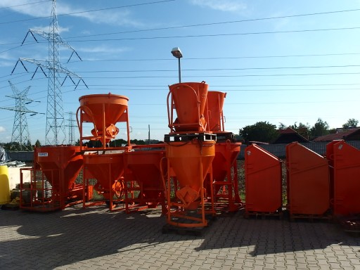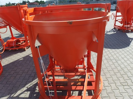 Pojemnik do betonu z przeznaczeniem do transportowania masy betonowej i innych materiałów o podobnej konsystencji. Zastosowany szczękowy mechanizm spustowy, posiada łatwy sposób otwierania za pomocą pałąka. Odpowiednia konstrukcja mechanizmu spustowego gwarantuje swobodne otwieranie pojemnika przy użyciu niewielkiej siły. Zastosowany system zamykania zapobiega samoczynnemu otwarciu się pojemnika dzięki odpowiedniego mechanizmu przekładniowego. Na wyposażeniu znajduje się uchwyt dźwigowy. Pojemnik charakteryzuje się solidną konstrukcją i dużą trwałością a przede wszystkim dopuszczony jest do prac budowlanych przez Urząd Dozoru Technicznego na podstawie Deklaracji Zgodności oraz Dokumentacji Techniczno Ruchowej.
