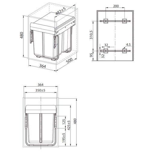 Produkt zawiera: Stelaż do koszy, Komplet prowadnic pełnego wysuwu z cichym domykiem, 1x pojemnik 20 L, 2x pojemnik 10 L