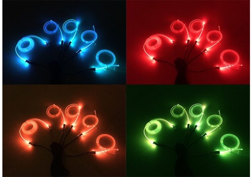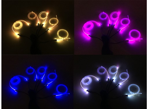 W zestawie znajduję się 5 przewodów zakończonych diodami LED, do których podłączamy odpowiednio odcinki światłowodu o dowolnej długości, które otrzymamy poprzez przecięcie na pięć części dołączonego do zestawu światłowodu o łącznej długości około 5,8 metra.