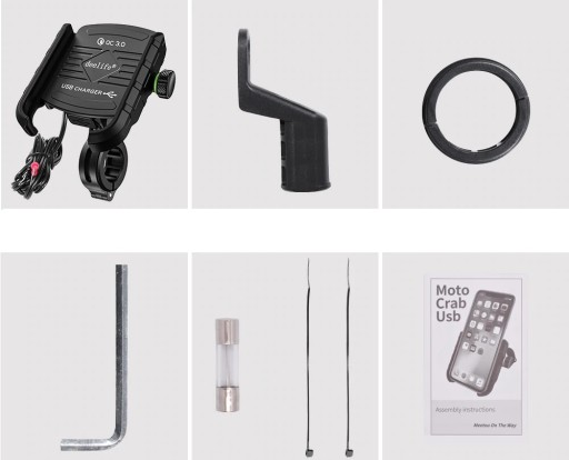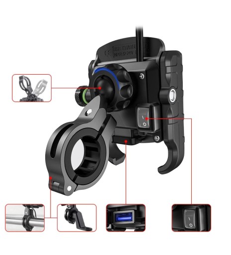 Najważniejszą zaletą uchwytu jest wodoodporne gniazdo USB szybkiego ładowania QC3.0, dzięki któremu już nigdy nie rozładuje Ci się telefon podczas wyprawy. Uchwyt posiada włącznik ON/OFF i kabel o długości ok. 150cm zakończony "oczkami" pod klemy akumulatora i bezpiecznikiem. Zabezpieczenia przeciw przeładowaniu i zbyt dużemu napięciu dodatkowo zabezpieczą podłączone urządzenie.