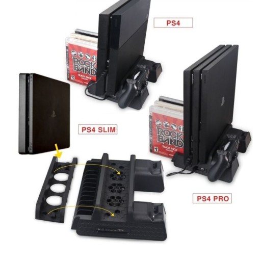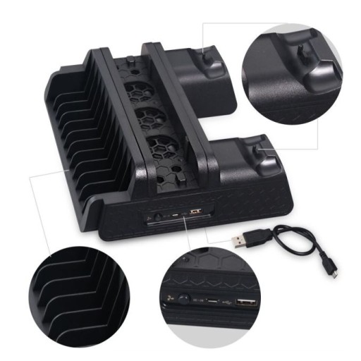 Podstawka umożliwia postawienie konsoli PlayStation 4, SLIM lub PRO na bocznej ściance. Pozwala to na zaoszczędzenie miejsca. Podstawka wykonana jest z mocnego plastiku, dzięki czemu może służyć latami. Stojak wyposażony w 3 wentylatory zapewniające chłodzenie konsoli. Stacja zawiera 2 doki do padów umożliwiające ich ładowanie. Dodatkowo wyposażona jest w 1 port USB i stojak na 12 gier. Produkt jest fabrycznie nowy.