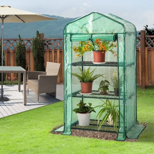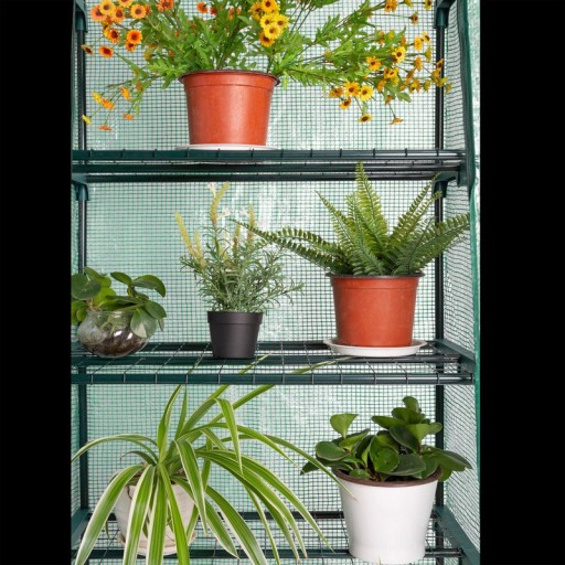 Szybki montaż bez narzędzi dzięki praktycznemu systemowi wtyków. Folia przepuszcza wystarczającą ilość światła słonecznego, zapewnia idealną cyrkulację powietrza - jeśli robi się za gorąco, po prostu otwórz zamkiem drzwi i zwiń je. Wewnątrz namiotu foliowego stabilne półki oferują miejsce dla małych roślin. Każda półka może zostać obciążona do 10 kg. Dolna krawędź poszycia jest nieco dłuższa niż rama. Zaleca się obciążenie wystających krawędzi ziemią lub kamieniami w celu zwiększenia stabilności. W celu optymalnego zamocowania dołączone są linki i kotwy gruntowe.