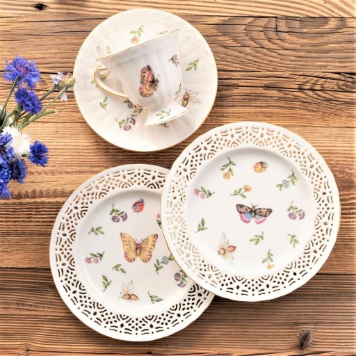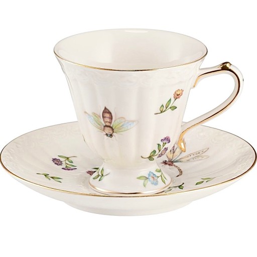 Absolutnie wspaniała filiżanka do kawy / herbaty z najwyższej jakości porcelany w kolorze mlecznej bieli. Dekorowana modnym ogrodowym wzorem w radosne kwiaty i urocze owady. Zdobiona ręcznie misternym ażurem oraz złotem. Polecamy!