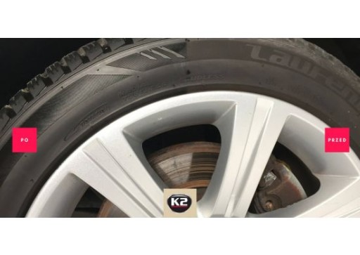 Chroni przed zanieczyszczeniami drogowymi i promieniowaniem UV. Dzięki wysokiej hydrofobowości zapobiega ponownemu osadzaniu się brudu. Po użyciu K2 BOLD opony pozostają lśniące przez długi czas.