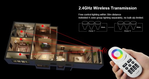 Sterowania 4 Strefami - Pilot umożliwia sterowanie czterema strefami, niezależnie lub jednocześnie. Można do jednej strefy przypisać wiele kontrolerów, żarówek lub podzielić urządzenia by pracowały w różnych strefach.