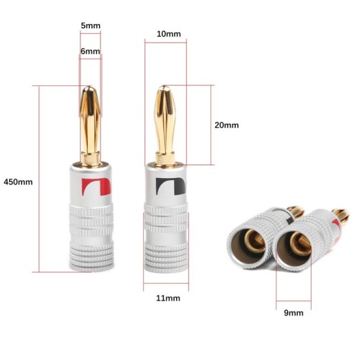 Wtyki przeznaczone są do montażu na kablu głośnikowym służącym do połączenia kolumn ze sprzętem audio. Każdy pokryty jest 24-karatowym złotem co poprawia jakości przesyłanego sygnału i chroni przed utlenianiem, gwarantując wieloletnią bezawaryjną pracę.