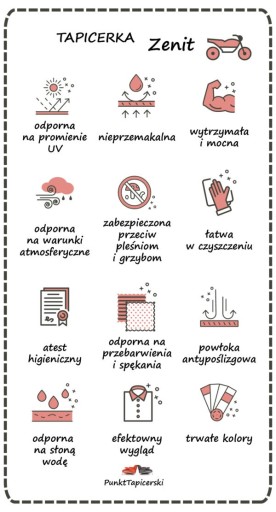 Sztuczna Skóra "Zenit" Prezentowana eko-skóra jest najwyższej jakości. Swoimi właściwościami przewyższa nawet skóry naturalne. Powyższa eko-skóra posiada wszelkie atesty, jest nietoksyczna, nie wywołuje uczuleń oraz alergii. Ponad to posiada powłokę antypoślizgową.