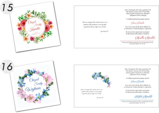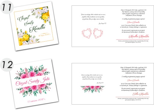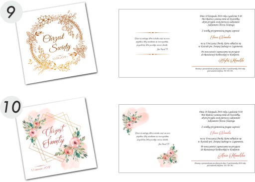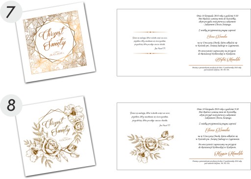 - personalizację zaproszeń (lista gości, data, godzina uroczystości itd.) wykonujemy przy zakupie min. 10 sztuk (zakup poniżej 10 sztuk traktujemy jako próbki - wysyłane są z przykładowym tekstem widocznym w treści aukcji);