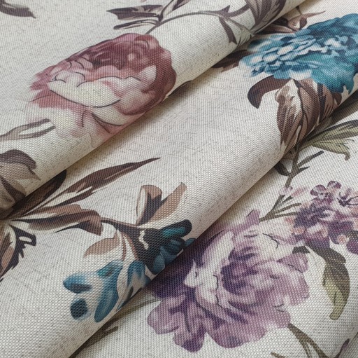 Tkanina ROSE - Popularna tkanina obiciowa typu plecionka z bardzo oryginalnym wzorem. Delikatnie i gęsto tkany splot przypominający surowe nitki lnu. Oryginalne, nadrukowane na materiale wzory z motywem róż w pastelowej kolorystyce.