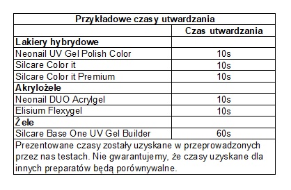 Poniżej tabela prezentująca wyniki wykonanych przez nas testów wraz z czasem (trybem) gwarantującym utwardzenie poszczególnych preparatów.