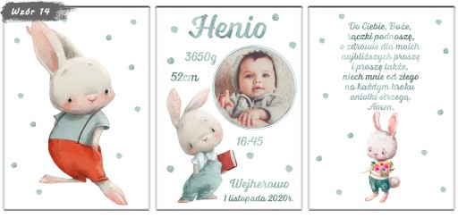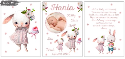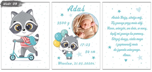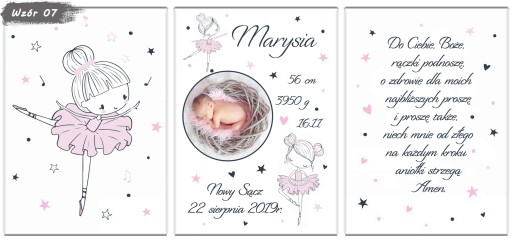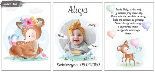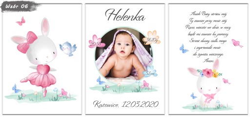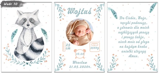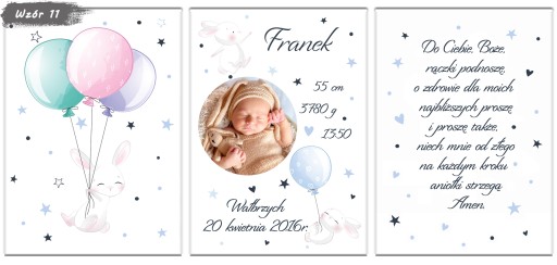 Zestaw 3 plakatów do pokoju Twojego maluszka. Metryczka ze zdjęciem, obrazek i modlitwa w formacie A4. Aukcja dotyczy plakatów bez ramek, metryczki w ramkach dostępne na naszych innych aukcjach.
