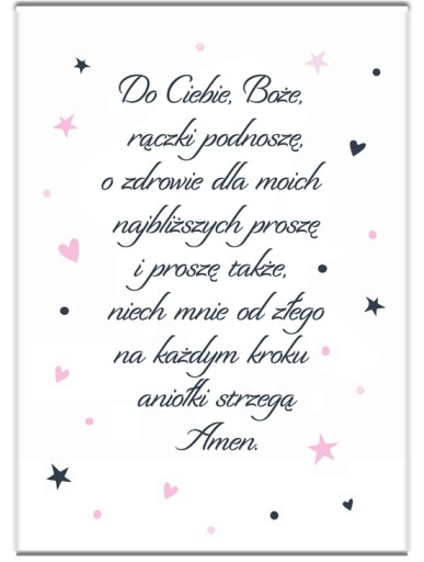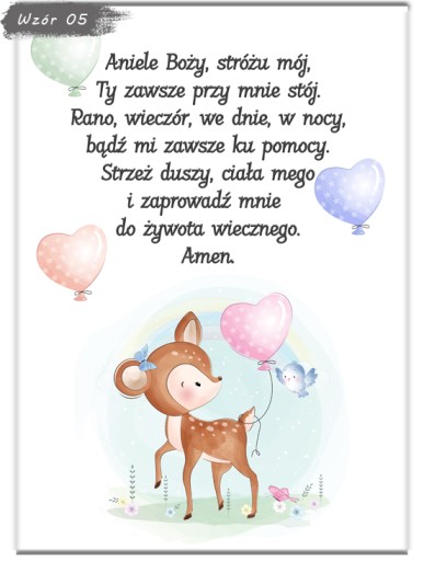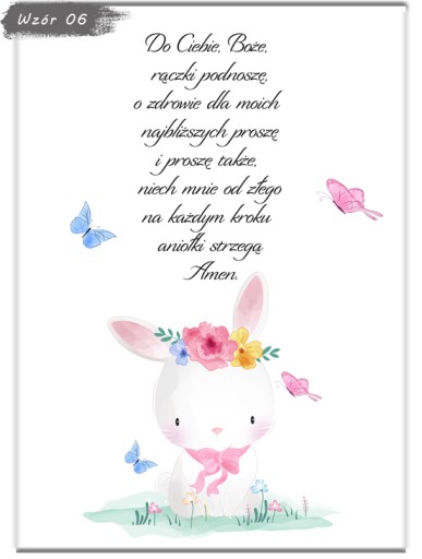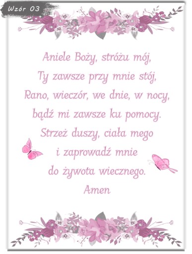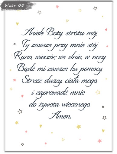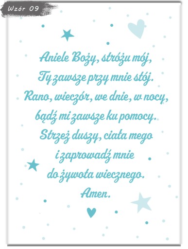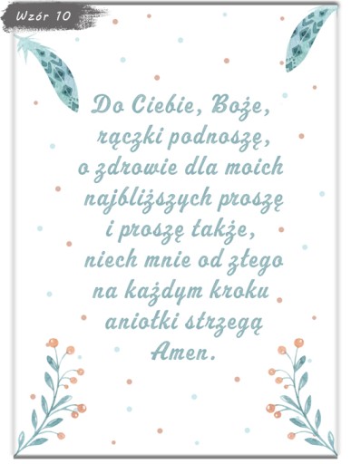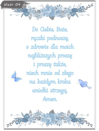 Zapraszamy do wyboru modlitwy w formacie A4 (21x29,7cm) w ramce do wyboru (ramki z ochronna plexi, zabezpieczone folią z możliwością postawienia jak i powieszenia). Plakat drukowany jest na profesjonalnym papierze fotograficznym oraz oprawiony od razu w ramkę. Informację zawarte na wzorach są przykładowe i można je dowolnie modyfikować - usługa jest bezpłatna!