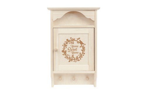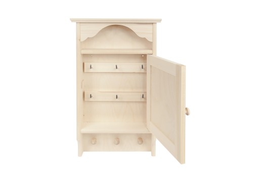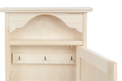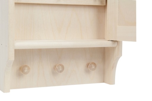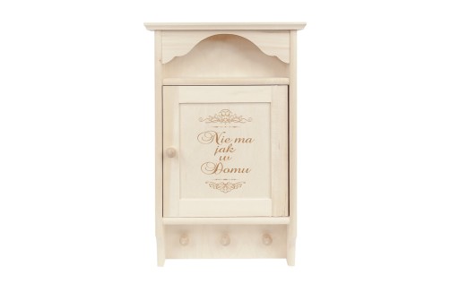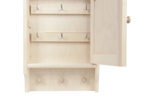 Szafka na klucze z zamykanymi drzwiczkami. Wewnątrz 6 haczyków na klucze. Poniżej drzwiczek dodatkowe 3 drewniane kołki.