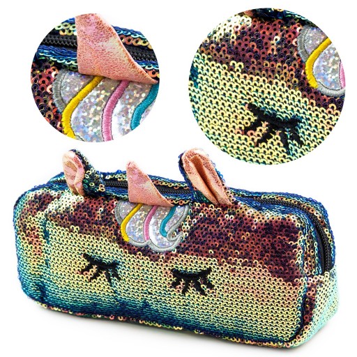 Wyjątkowy i jedyny w swoim rodzaju. Mieniący się kolorami gadżet to również doskonały pomysł na kosmetyczkę. Kosmetyczka wykonana została z ciekawego materiału i wyścielona została podszewką. Piórnik pomieści wszystkie niezbędne przybory. Zapinany na gustowny zameczek.