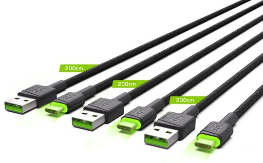 Zestaw 3x Kabel Green Cell GC Ray USB-C 200cm z zielonym podświetleniem LED, szybkie ładowanie Ultra Charge, QC 3.0