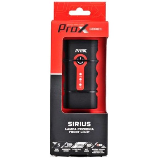 ProX Sirius to super kompaktowa lampka do roweru. Wyposażona została w dwie mocne i jasne diody CREE XP-G3. Wytwarzają one strumień światła o dużej mocy 900 Lumenów. Latarka świeci w pięciu trybach. Trzy z nich, to tryby stałe: wysoki(100%) do 2:40h, średni(50%) do 5:20h i niski(20%) do 9h. Pozostałe dwa warianty, to tryby migające: FL1 do 12h i SOS do 10h. Lampka na rower ProX Sirius posiada trzystopniowy wskaźnik stanu energii w akumulatorze, dzięki czemu nigdy nie zaskoczy Cię brak mocy i gaśnięcie latarki. Zasilanie odbywa się przy udziale akumulatora litowo-jonowego o pojemności 5200 mAh, a ładowanie za pomocą kabla USB. Lampka rowerowa ProX Sirius została wykonana z połączenia aluminium i tworzywa, charakteryzuje się wodoodpornością w klasie IPX4.