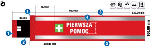 ✅ 1. uchwyt do zapięcia z taśmy typu rzep ✅ 2. elastyczna gumka lepiej przytrzymująca opaskę na ramieniu ✅ 3. paski odblaskowe na całym obwodzie opaski ✅ 4.haft PIERWSZA POMOC