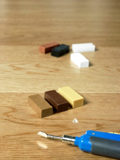 Zestaw naprawczy Quick-Step pomoże z łatwością usunąć drobne uszkodzenia bez utraty oryginalnego koloru podłogi. Wystarczy odtworzyć kolor uszkodzonych (na przykład przez spadające nożyczki) desek, stosując jeden z siedmiu kawałków wosku dobranych do wszystkich kolorów podłóg firmy Quick-Step.