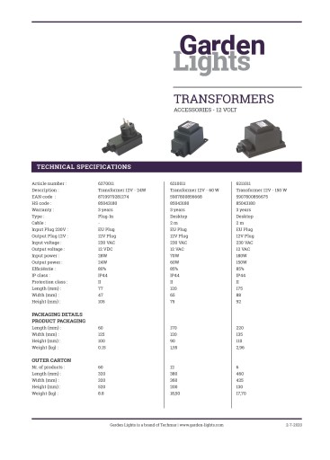 Transformator w obudowie wodoszczelnej IP 44. Do stosowania wewnątrz i na zewnątrz. Posiada specjalne gniazdo do hermetycznego połączenia z przewodem 12 Volt wszystkich lamp Garden Lights.
