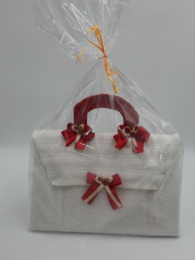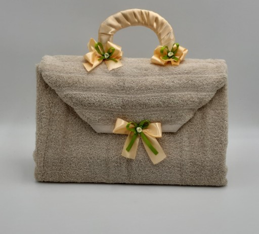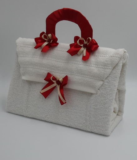 Torebka z ręcznika - to ciekawa i oryginalna forma pakowania - świetnie sprawdza się jako forma prezentu na imieniny, urodziny, osiemnastkę. Do formowania używamy sznureczków (do ich wiązania) lub taśmy klejącej - dlatego, żeby rozpakować ręcznik uważnie i delikatnie rozetnij sznureczki lub usuń taśmę klejącą, jeśli chcesz, żeby ręcznik posłużył Ci do wycierania. Do dekoracji używamy elementów, które w łatwy sposób można z ręcznika usunąć (samoprzylepne).