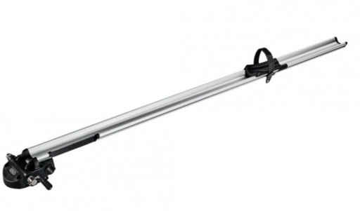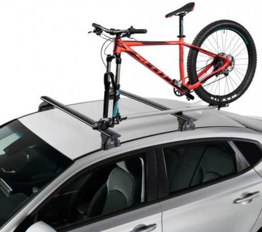 - Prosty w obsłudze aluminiowy uchwyt rowerowy za widelec montowany na belkach dachowych samochodu.