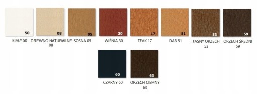 Biały-Czarny-Orzech ciemny-Orzech Jasny-Jesion-Sosna-Dąb-Dąb Ciemny-Dąb Średni-Teak-Bezbarwny-Czereśnia Jasny