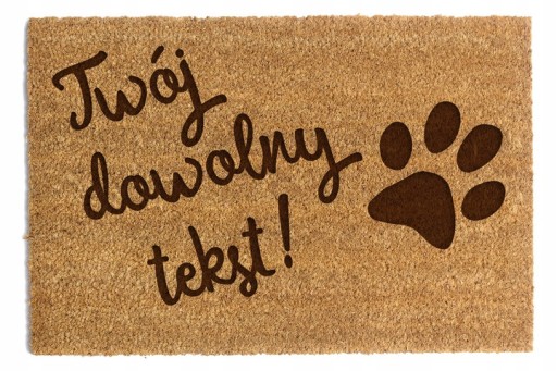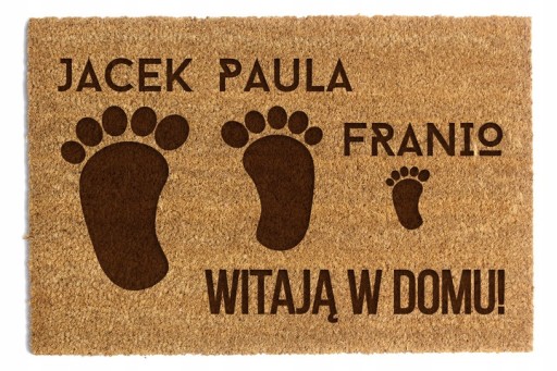 Przykład: Jacek, Paula, Franio. Do wycieraczki dodamy stópki oraz napis "Witają w domu". Każde słowo jest tej samej wielkości.