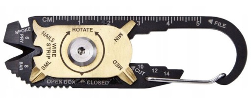 Funkcjonalny, niewielki Multitool wykonany z wysokiej jakości stali nierdzewnej, pokrytej warstwą tytanu oraz stalowego obrotowego modułu z czterema narzędziami. Za jego niezawodną pracę odpowiada wysokiej jakości łożysko kulowe. Dysk blokuje się w jednej z czterech pozycji. Karabinkowe zapięcie umożliwia pewne i wygodne noszenie toola.