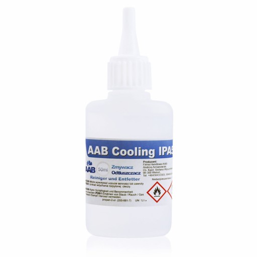 AABCOOLING IPA 50 ml to doskonałej jakości preparat od AABCOOLING, składający się z alkoholu izopropylowego o najwyższej czystości. Uniwersalny preparat do czyszczenia i odtłuszczania różnego rodzaju urządzeń i elementów. Posiada doskonałe właściwości czyszczące, z powodzeniem usuwa tłuszcz, smar oraz inne zanieczyszczenia. Skutecznie poprawia właściwości i sprawność działania urządzeń elektrycznych.