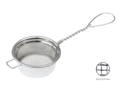 Wysokiej jakości sitko metalowe do parzenia herbaty lub ziół jak i przecierania innych produktów. Idealne do użytku domowego jak i profesjonalnego. Posiada haczyk ułatwiający zawieszenie oraz wysoki kołnierz umożliwiający wsypanie/wlanie większej ilości produktu. Wykonane z ocynowanej blachy, drutu oraz siatki o bardzo drobnym oczku 0,4 x 0,4 mm.