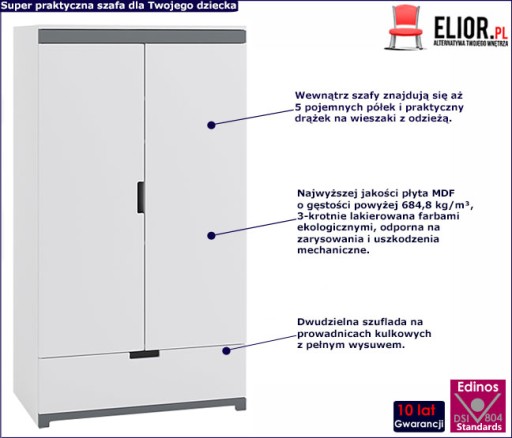 Obok łóżka, komody, biurka w pokoju dziecięcym niezbędna jest szafa. Marka Elior z myślą o małych królewnach i królewiczach kolekcję mebli Candy wzbogaciła o kolejny produkt. Z radością przedstawiamy Ci dziecięcą szafę Candy 3X. Nasza szafa to dzieło doświadczonych projektantów marki Elior, którzy sami są rodzicami i doskonale wiedzą czego każde dziecko potrzebuje. Prezentowany mebel to niezwykle praktyczny model. Wnętrze szafy Candy 3X zostało podzielone na 2 części, w których mieści się drążek na odzież na wieszakach i aż 5 pojemnych półek. Dodatkowo producent wzbogacił szafę w dwudzielną szufladę na bieliznę, skarpetki, rajstopy czy inne przedmioty Twojego dziecka. Tak funkcjonalnie rozplanowana i pojemna szafa posłuży Twojemu dziecku przez wiele długich lat.