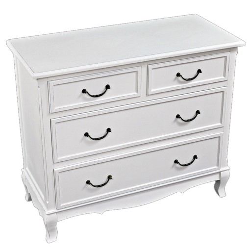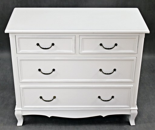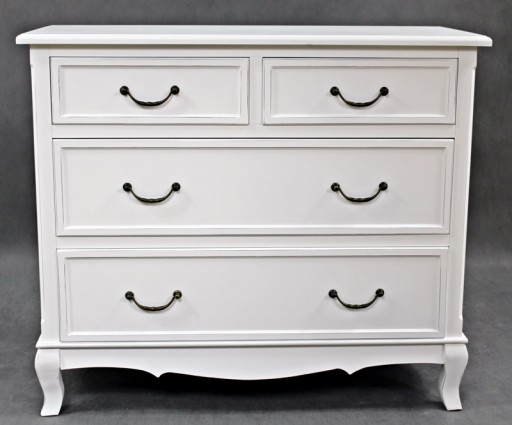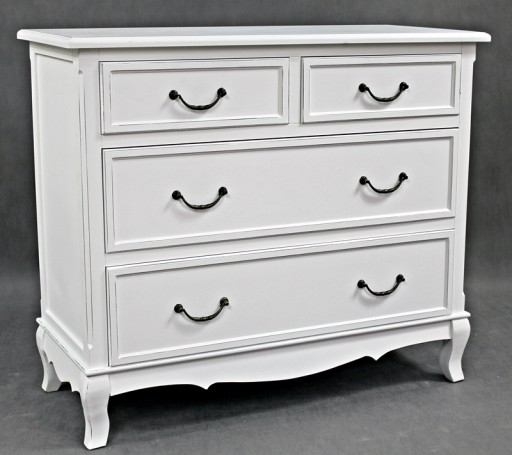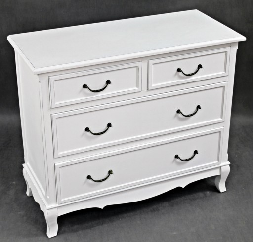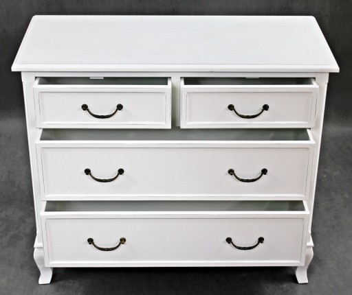 Urokliwy mebel z czteroma szufladkami i stylowymi uchwytami .