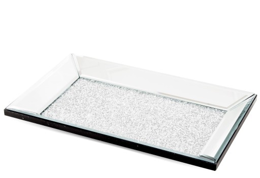 Prezentowany model wykonano z łączonych płyt mdf, do których przytwierdzono podłużne zwierciadła. Każde ze zwierciadeł ma elegancką fazę przy krawędzi. Oszklone dno patery wysypano drobnymi kryształkami.