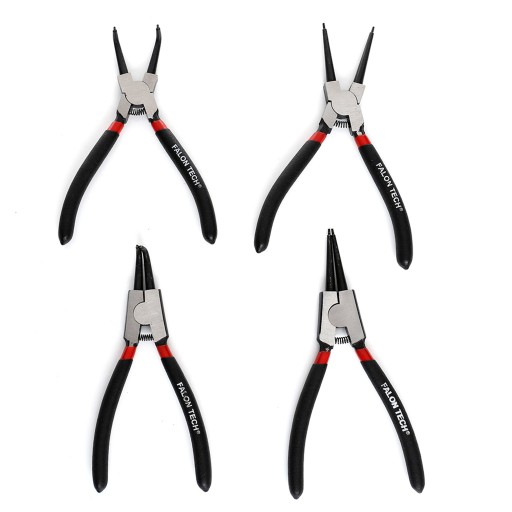 Zestaw dostosowany do pracy z pierścieniami wewnętrznymi i zewnętrznymi. Posiada szczypce z wygiętymi oraz prostymi końcówkami oraz 2 typy tych zabezpieczeń: wewnętrzne (rozprężne w środku tulei) i zewnętrzne (zaciskowe, na zewnątrz wałka). Szczypce są wykonane z trwałej i wytrzymałej stali chromowo-wanadowej, posiadają rączki pokryte gumą. To doskonałe narzędzia do montażu i demontażu pierścieni sprężystych.