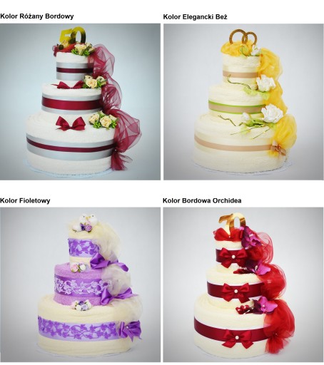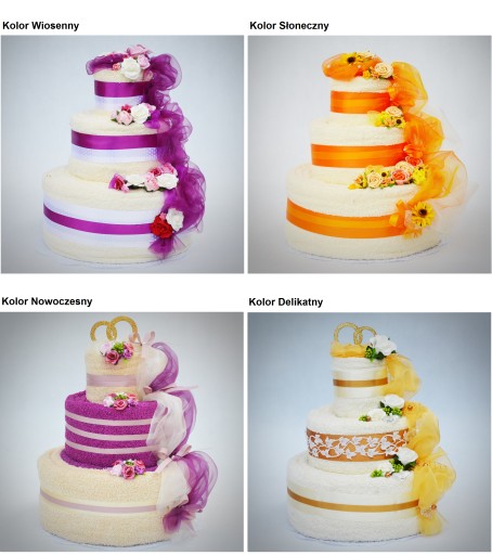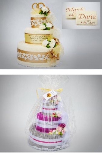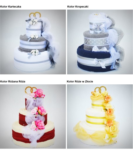 Piękny i oryginalny prezent na ślub i rocznicę ślubu - praktyczny i elegancki komplet 4 ręczników w kształcie tortu z bogatą dekoracją kwiatową.