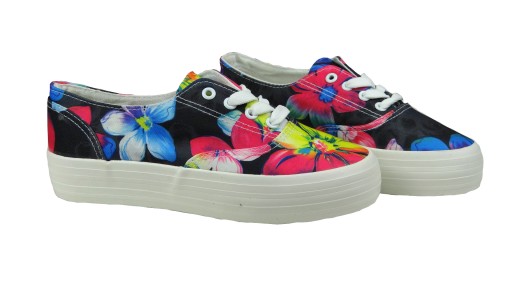 Czarne wielokolorowe tenisówki damskie WISHOT na wysokiej platformie to obuwie idealne do codziennego użytku, świetnie sprawdzi się w stylizacjach sportowych lub casualowych. Wykonane z solidnej tkaniny odpornej na ścieranie. Dzięki grubej, mocnej podeszwie obuwie doskonale amortyzuje wstrząsy, powodując jeszcze większy komfort użytkowania.