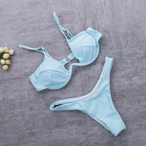 Kobiecy i niezwykle seksowny komplet kąpielowy składający się z biustonosza oraz majteczek o kroju brazylian.