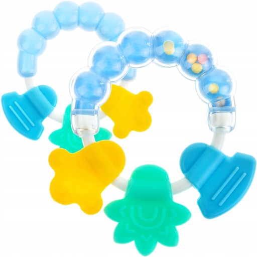 Grzechotka z gryzakiem łączy w sobie zalety gryzaka i grzechotki, gdyż pokryta jest gumową warstwą z wypustkami, niosącymi ulgę ząbkującemu maluchowi.