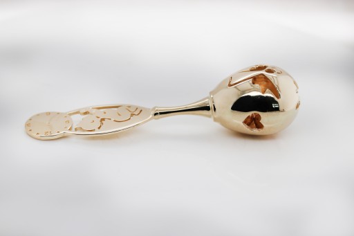 Grzechotka wykonana z 14-karatowego złota z ozdobną główką i uchwytem. W środku grzechotki znajdują się złote kulki.