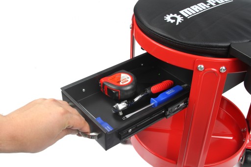 Niezwykle solidny taboret do wykorzystania w warsztatach, posiada miękkie, wygodne siedzisko, solidną metalową konstrukcję a także dwie wsuwane na prowadnicach szufladki wyposażone w uchwyty a także DODATKOWO GRATIS cupholder z miejscem na dwie butelki