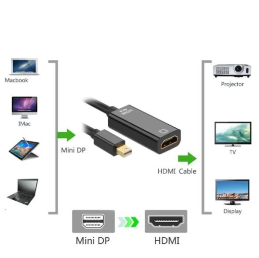 Dzięki temu adapterowi możemy podłączyć wyświetlacz HD ( projektor, telewizor HD) do sygnału wejściowego z mini DisplayPort na bazie MacBook Pro, MacBook Air, iMac, Mac mini, Mac Pro lub dowolnego innego urządzenia z mini DisplayPort. Wspiera HDMI 1.4b ( kompatybilny z poprzednimi wersjami); Przesyła skompresowany dźwięk, DTS Digital, Dolby Digital (w tym DTS-HD i Dolby True HD). Pozłacane porty, odporne na korozję, zapewniają sztywność i poprawiają wydajność sygnału audio / wideo.