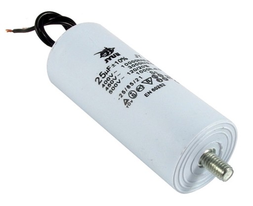 Kondensator rozruchowy do silników 25uF/450VAC +/-10% 40x95mm Temp. pracy -25C~+70C, sposób mocowania: śruba M8, przewód o średnicy 2,8mm