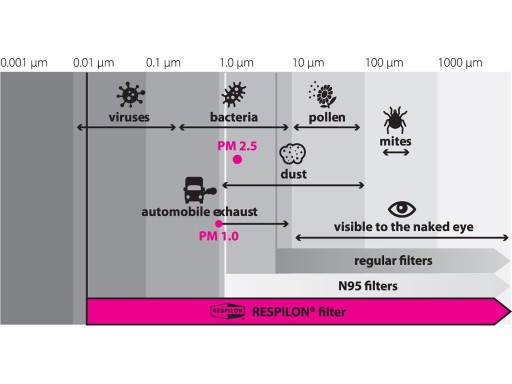 - Zintegrowana membrana nanowłókna RESPILON® blokuje 99,9% kurzu, smogu, popiołu, roztoczy, alergenów, bakterii lub wirusów