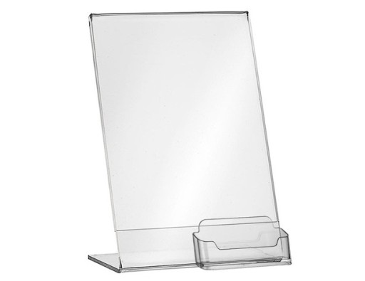 Stojak akrylowy typu L , przeznaczony do prezentacji informacji na ladzie, stoliku lub biurku z doklejonym stojakiem na wizytówki. Stojak wykonany jest z giętego tworzywa o grubości 2 mm,a stojak na wizytówki jest odlewany z formy. Informację wymienia się w prosty sposób, wsuwając ją od boku. Stojak informacyjny w kształcie litery L , przeznaczony jest do jednostronnej prezentacji. Standardowo stojak jest przymocowany z prawej strony (patrzą od przodu), ale na życzenie klienta możemy go umieścić z lewej strony.