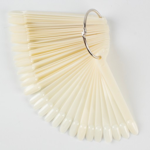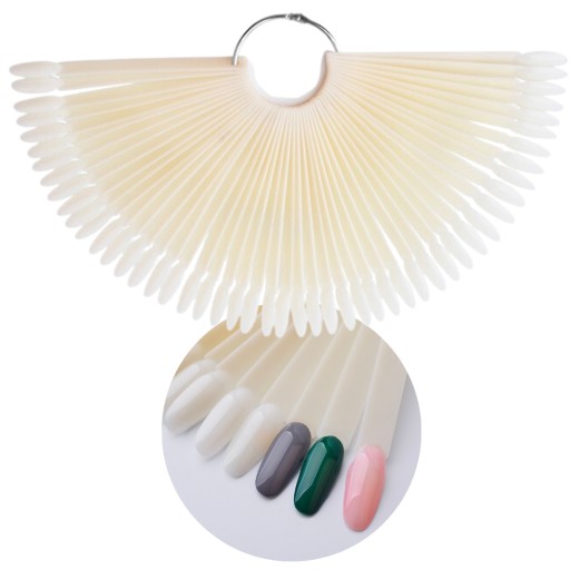 Praktyczny wzornik lakierów z 50 tipsami w kolorze mlecznym w kształcie migdała. Próbnik w formie wachlarza na metalowym kółku. Będzie bardzo pomocny podczas wybierania koloru lakieru lub wzorku na paznokcie. To bardzo czytelna, wygodna oraz estetyczna paleta do malowania lakierami klasycznymi, hybrydowymi lub żelami. Wzornik jest poręczny, solidnie wykonany, przydatny w każdym salonie kosmetycznym.