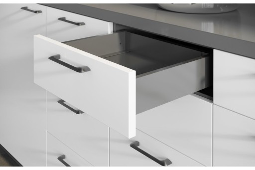 się w każdy model mebla. Dzięki ultra cienkim płaszczom bocznym użytkownik zyskuje dodatkową przestrzeń wewnątrz szuflady. Sercem systemu jest niezawodna prowadnica, której precyzja mechanizmu cichego domyku, pełen wysuw oraz wysoka ładowność zapewniają najwyższy komfort użytkowania mebla.