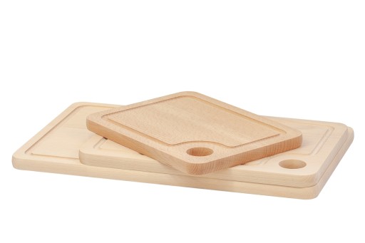 Na jednej stronie deski wyfrezowany kanał odprowadzający nadmiar soku z potraw oraz otwór umożliwiający zawieszenie.