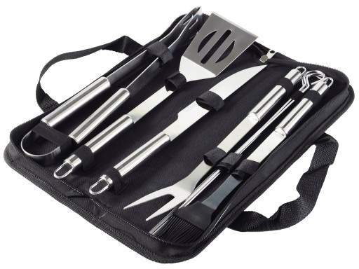 - Skład zestawu : szczypce 34 cm., łopatka 35 cm., widelec 35 cm., nóż 32,5 cm , pędzelek 34 cm., 4 x szpikulec do szaszłyków 36,5 cm , etui.