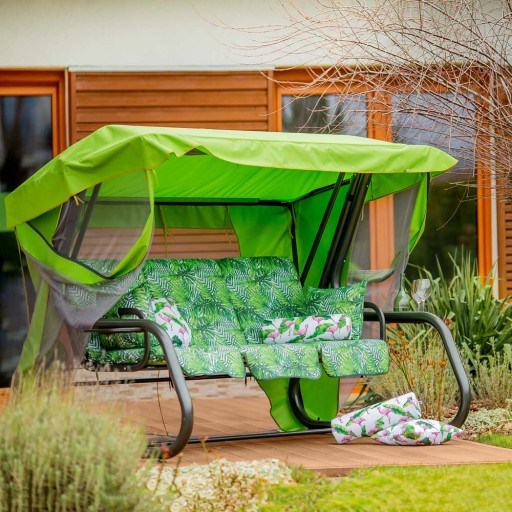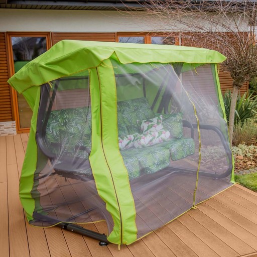 Daszek w kolorze zielonym i siatka w kolorze szarym, siatka wyposażona w 5 zamków błyskawicznych na bokach + 1 mocujący do daszka. Moskitiera okala całą huśtawkę, dopasowana jest do huśtawki Rimini / Venezia.