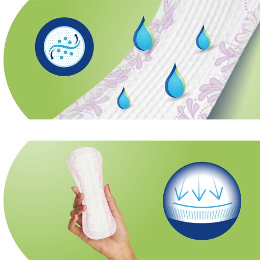 Wkładki TENA Lady Normal zawierają odświeżające mikroperełki, które zamykają płyn wewnątrz i zapobiegają powstawaniu przykrych zapachów.